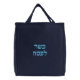 Make a stylish statement with this roomy tote bag with light blue Hebrew text on a dark navy blue background. Carry it as a fun part of your Passover tradition. See you at the Seder and may all your matzoh balls float!