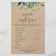 This kraft foliage "what's in your phone" game is perfect for a rustic baby shower. The front of the game card features "guess the right price", and the back of the card features "what's in your phone". The design features a frame of green leaves and leafy greenery botanicals on a faux kraft paper background. Personalize the front of the card with the name of the mom-to-be and baby shower date. You can personalize the game questions by clicking the "customize" button.