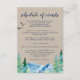 This kraft mountain wedding weekend schedule of events enclosure card is perfect for a mountain destination wedding. The design features a blue and green painted wilderness landscape with watercolor pine trees, birds and mountains on a faux light kraft paper background.