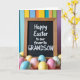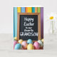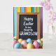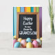This greeting card features a rustic, wood-framed blackboard with a deep matte surface that sets off white lettering placed neatly across the center, with a smaller line of text tucked just below like a quiet note between close friends. The wood frame shows natural grain and warm brown tones, giving the scene a cozy, grounded edge. In the foreground, a scattering of smooth egg shapes spills across the bottom, their soft shine catching gentle light like they were just set down together. The eggs are colored in pastel pink, pale blue, and sunny yellow, with a few decorated in simple stripes and dotted patterns that feel lighthearted 🐰. Behind the board, the background fades into a soft blur of tall vertical bands in azure, marigold, tangerine, and amethyst, like a painted wall out of focus. The contrast between the crisp white text and the dark board draws your eye first, while the pastel eggs add a sweet, shared-spring mood 🌷. The blurred backdrop shows tall vertical bands of blue, yellow-orange, and purple rising behind the blackboard.