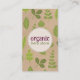 A natural organic business card design for the health business or businesses geared towards nature or natural skin care, food or healthy eating. It has a brown kraft paper background, with a green leaves pattern and accents of plum purple for a bit of fun. Also great for health stores, holistic therapists, natural spa clinics, people geared towards vegetarian and vegan and similar all-natural, organic industries.