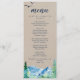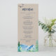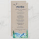 This kraft Rocky Mountain wedding dinner menu card is perfect for an outdoor wedding. The design features a blue and green painted wilderness landscape with watercolor pine trees, birds and mountains on a faux light kraft paper background. This menu can be used for a wedding reception, rehearsal dinner, or any event.