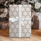 Christmas gift wrapping paper feature modern snowflakes in white on kraft paper.