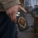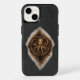 The emblem is vertically composed and positioned to respect the OtterBox camera cutout, with an elongated ash-and-dust halo that gives the mark weight and presence without clutter. Rendered in aged brass tones with ink-dark grit, the design reads instantly in-hand while holding up under close inspection.