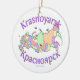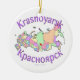 Colorful map ornament of the Russian Federation with Krasnoyarsk city location marked with a flag. City name also in Russian - Красноярск . Unique Russia family or adoption or Christmas gift for families with children from Krasnoyarsk. Designed by Hendrika of www.RedThreadMaps.com