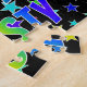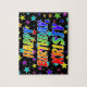 This vibrant and fun birthday-themed jigsaw puzzle design features the message "HAPPY BIRTHDAY, KRISTY" with the characters having a colorful rainbow spectrum inspired gradient pattern, in addition to a lively star shapes background pattern. A colorful puzzle like this might be used to send birthday greetings to somebody named Kristy. [~Z0000468]