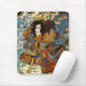 Kuniyoshi Samurai mouse pad. Ukiyo-e woodblock from Edo Period Japan. Utagawa Kuniyoshi designed some of the most vibrant and impressive samurai paintings of the Edo period. His depiction of Shimamura Danjo Takanori features the samurai in full armor wielding his naginata while riding the waves of the sea on the backs of two blue crabs. The samurai has been hit by multiple arrows, but fights on fiercely with waves and crabs rising in the background. A great gift for fans of Utagawa Kuniyoshi, samurai paintings, and Japanese art.
