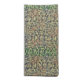 An abstract, graphic pattern-in a richly, woven, tapestry of; green, red, yellow, orange, taupe, brown, and black.