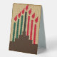 Image printed on table tent is from a photo of an original tapestry crochet wall hanging designed handmade and Copyright © by published designer Delores Chamblin. The picture of the unique handcrafted creation with red black and green Kwanzaa candles in wood brown kinara is reproduced on the stand alone tent.
