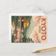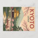 vintage travel poster for Kyoto, Japan in a retro vector style. Feature a serene scene of Kinkaku-ji (Golden Pavilion) reflecting in a still pond, surrounded by lush green trees and cherry blossoms in soft pink. Add a misty Mt. Hiei in the background. Use bold outlines, warm sunlit hues, and traditional Japanese typography for the city name. Add a few people in traditional kimonos walking on a red arched bridge."