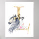 Beautiful personalized gold floral monogram letter with watercolor horse and name.
