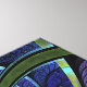 Faux stained glass leaves of green and turquoise frame a central flower in shades of blue and purple.