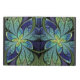 Faux stained glass leaves of green and turquoise frame a central flower in shades of blue and purple.