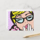 This Customizable La-Di-Da Lady Comic Book Postcard is whimsy at its finest! The design features a delightfully quirky woman with blonde hair piled on her head wearing cat-eye glasses and a pink and white zebra print collar. One white gloved hand is resting on her pink lips as if she is suppressing a giggle. The woman is on a lavender and white polka dot background. It's the perfect postcard to send people who share your inside jokes!