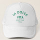 The Amalfi Coast trucker hat is the perfect everyday hat for your beach trip. Sea green "La Dolce Vita" lettering. Personalize with the details of your vacation... year and destination. Perfect for a family or friends vacation or destination bachelorette or as a memento for a past trip. Matching accessories available in the La Dolce Vita Amalfi Coast Cabana Stripe Collection.