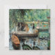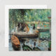Pierre-Auguste Renoir. La Grenouillère . lovely landscape on the river in green tones. There are boats on the shore. In the middle ground, a group of people stands on a walkway under a spreading tree. In the background there are yazta and trees. Reproduction of famous works of art images in the public domain.