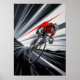 A dramatic Art Deco oil painting capturing a female cyclist in a fiery scarlet jersey leaning aggressively into a turn, her stylized form defined by harsh, theatrical chiaroscuro lighting against a stark monochrome background.