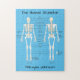 This design features both the anterior and posterior views of the human skeleton. with the major bones labeled.