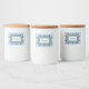These delightful labels can be used onany kinds of jars and canisters. They can be used in the kitchen, pantry, nursery, or office. The decorative frame is blue and green on white. It is a design of handmade tile from Oregon Tile maker Fay Jones Day. Customize it.