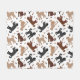 Cute labradoodles in brown, black and tan coats sit, stand and lay with scattered dog bones and paw prints on a white background.