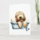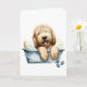 Cute dog watercolor illustration of a happy fluffy Labradoodle dog in a bathtub. Great for dog lovers.