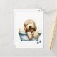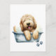 Cute dog watercolor illustration of a happy fluffy Labradoodle dog in a bathtub. Great for dog lovers.