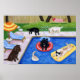 Cute and colorful Labrador Retriever Pool Party painting. Black Labrador, Chocolate Labrador, Yellow Labrador are all painted in the picture. Labradors are having a Pool Party in their beautiful garden!! Whimsical and funny Labrador Retriever Art painted by Naomi Ochiai. Labrador gifts for Labrador lover's home. Great fun gifts for yourself, too.