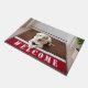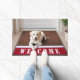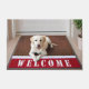 Blond Labrador Retriever dog on a red and brown mat with welcome text by front door.