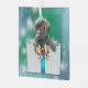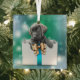 On this beautiful Holiday ornament is the image of an adorable black Labrador Retriever puppy peeking out of a gift box. The box is decorated with a gold bow and teal blue ribbon. The image stands out against a gradient green and blue bokeh background.