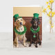 This card shows two Labrador-type dogs sitting close together, one golden and one chocolate brown, dressed up for St. Patrick’s Day with a sweet, steady closeness that reads like old friends. Soft light falls across their fur, bringing out warm highlights on the golden coat and deeper shine on the darker dog’s face. Each wears an emerald green top hat with a gold buckle, and the matching hats make them look like a coordinated pair rather than two separate portraits. Around their necks are leafy green wreaths that frame pearl necklaces, adding a dressy touch that feels a bit romantic in how carefully they’re styled. The lighter dog’s pearls include a small green bead, while the darker dog’s strand ends in a bright green shamrock pendant ☘️. Their eyes face forward with a calm, slightly serious look, which makes the fancy outfits feel even more affectionate and funny at the same time 💚. The greeting “Happy St. Patrick’s Day” appears near the top in green lettering, standing out clearly against the plain, homey background. Behind them, the setting stays simple and softly toned so the hats, pearls, and shamrock remain the sharpest details in the scene.