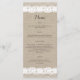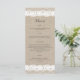 Beautifully illustrated white lace decorates this burlap colored menu.