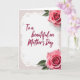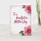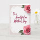 Designed with a calm, affectionate look, this Mother’s Day card centers on a deep magenta message that reads “To a beautiful on Mother’s Day,” set prominently in the middle. The lettering sits within a delicate white border that resembles a lace doily, filled with tiny floral cut-outs that feel like a gentle embrace ❤️. Behind it all, a softly textured pale taupe background keeps the mood quiet and tender, like a warm pause in the day. Two full-bloom flowers in blushing pink add a romantic touch, as if they’re leaning in toward the message with quiet admiration. Deep green leaves fan out around the petals, creating a natural contrast that makes the blooms look fresh and softly shaded. The text remains centered and easy to spot, while the floral details draw the eye to the right side without crowding the design 🌼. A large pink blossom rests in the top-right corner and another matching bloom sits in the bottom-right corner, both framed by the white lace-like border.