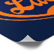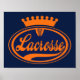Lacrosse is King. Cool, retro-style signage design. Oval with cursive lettering of the word lacrosse with lacrosse stick symbol within. Adorned with vintage crown. Lacrosse poster. Version: orange and blue.