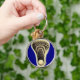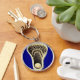 Unique lacrosse keepsake keychain gift featuring lax stick design on royal blue background for player, team coach or sports fan.