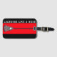 Creative lacrosse gear bag tag featuring lax stick art and funny quote on red background.