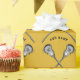 Lacrosse gift wrap or lax party decoration featuring crosse sticks on gold background. Edit text to add name of player or team coach.
