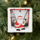 Unique lacrosse goalie holiday keepsake gift featuring creative Santa with a goalkeeper stick in front of a lax goal. Edit text to add goalie's name and the year.