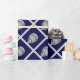 Lacrosse goalkeeper gift wrap featuring lax goalie stick illustration on a blue background.
