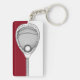 Lacrosse goalie keepsake keychain featuring lax goalkeeper stick illustration.