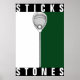 Funny lacrosse goalie "sticks and stones" motivational poster featuring lax goalie stick on green background. Add your custom text to personalize.