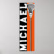 Cool lacrosse poster featuring lax stick design on an orange background. Edit text to add player's name.