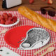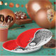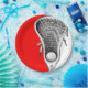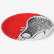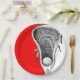 Cool lacrosse party plates featuring creative lax stick and ball art on red background for lacrosse party or team event.