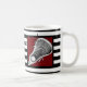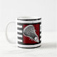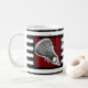 Unique lacrosse mug featuring lax stick art on maroon background with black and white stripes. To personalize, edit text to add lacrosse player's name.