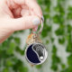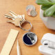 Unique lax stick keepsake gift keychain on navy blue background for lacrosse player, team coach and sports fans.