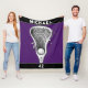 Personalized lacrosse gift blanket featuring stick-and-ball design on purple background. Edit text to add lax player's name and team number #.