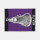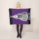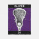 Lacrosse player or coach blanket featuring stick-and-ball design on purple background. To personalize edit text to add lax player's name and team number #.