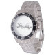 Has heft and feel of expensive stainless steel quartz watches. Good band with safety catch. I removed links, which is easy because engraved arrows show direction to push the linking pins. As always by this seller, the image (a railroad logo) is a perfect reproduction of my emailed image, and is precisely spaced and aligned.