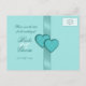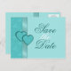 A faux satin turquoise ribbon delineate between a lovely tone on tone turquoise damask pattern and a solid light blue-green on the front of this romantic save the date announcement postcard. Two love hearts in the same damask and trimmed in dark blue-green lace accent the ribbon. All customizable text can easily be changed to suit your own needs.