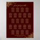 This 22 table wedding seating chart features a simple yet elegant design with gold text on a chocolate brown or auburn background and lacy gold frills or filigree in the corner. The script calligraphy title reads: Please find your table. Contains table assignments for 220 guests at 10 guests per table.