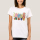 A ladies white T-shirt with a row of pots of colorful flowers, from a handpainted paper collage by Judy Adamson. Customizable.